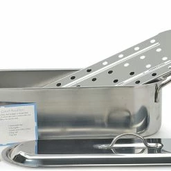 The RSVP Fish Poacher makes for perfectly cooked Salmon filets, Dover Sole, Mahi Mahi, Striped Bass and many more varieties without having to warm up the oven or dry out the fish. The RSVP Fish Poacher is created for gas or electric stove top, the poacher rests across two stove top burners for excellent steam delivery and even heat. This poacher comes with a removable grill insert on raised feet. The fish poacher lid has its own handles and flips over to double as a broiling pan. Forged from commercial grade stainless steel you will enjoy the extra sturdy handles when transporting a bulky load of fish.