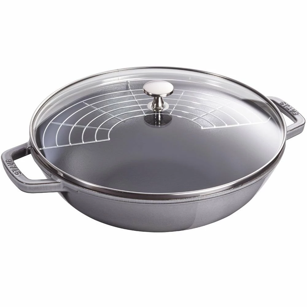 Search no further—the perfect pan is well within your reach! The Staub Perfect Frying Pan in Graphite Grey is the quintessential frying pan for everyday use. This frying pan set includes a half-moon shaped stainless-steel rack. The wide angled shape lets you stir and toss your food without spilling. Great for making lobster bisque, beefy chili, braised chicken plus so much more. This remarkable frying pan is resistant to rust, chipping and cracking. The coating requires no additional seasoning like some other cast-iron pieces so you can get to cooking up a marvelous dinner for all of your family and watch those smiles on their face appear.