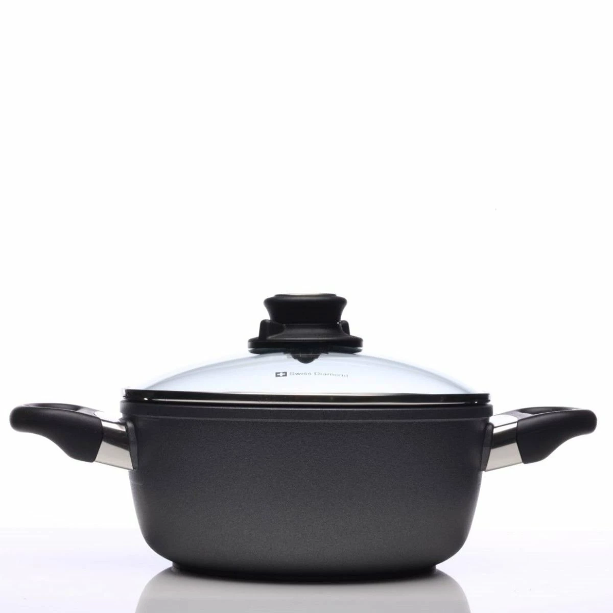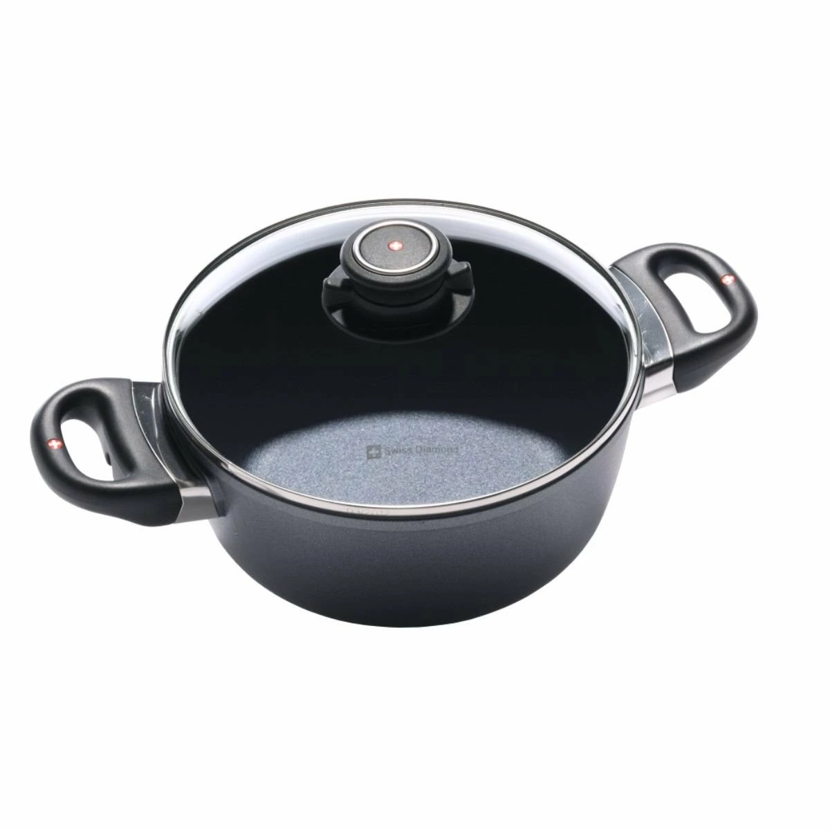 This Covered Casserole is 8” and has two side handles with a vented metal-rimmed heat tempered glass cover and is perfect for frying, casseroles, and chilies. This Swiss Diamond Casserole Pan is also a great pan to start on the stove, finish in the oven, and then serve in, since it is oven safe up to 500 F. Swiss Diamond is an award winning line of cookware, combining real diamond crystals with the non-stick nano composite, forming a virtually indestructible non-stick surface.